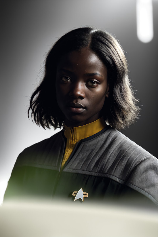 Latoya's rich dark skin and shoulder-length hair are accompanied by a soft set of lighter brown eyes and full lips which form to complete her attractive appearance. She's young and her features betray that youth, yet it's clear from the way she wears her gold-collared uniform that she's in excellent physical condition. She's of average height and weight for a Human with no distinctive markings on her body. |