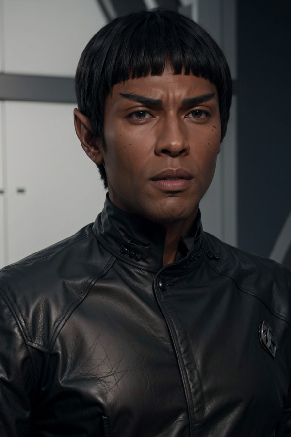 V'Lek's appearance is distinctly Vulcan with his most stand-out traits including a pair of pointed ears and rising eyebrows which produce an aura of persistent stoicism about him. His black hair is cropped close to his head in a traditional style often utilized by his people, and his dark-skinned complexion is accompanied by a pair of dark brown eyes and soft youthful features. |